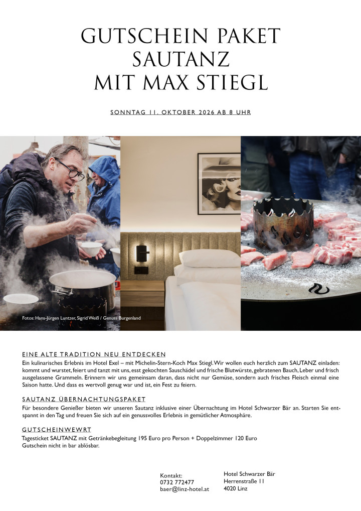 Folgendes ist beim Sautanz inkludiert: Hirn mit Ei I Bluttommerl I Leber I Nieren I Milzstrudel I Stichfleisch I Zunge I Kesselfleisch I Blunzn Bratwürste I Bauch I Krenfleisch I Schulter I Kopf I Beuschel I Herz I Magen I Klacheln Bohnenstrudel I Scheiterhaufen I Grammeln I Brot I Bauernkrapfen & Getränkebegleitung (Kaffee, Bier, Wein & A-freie Getränke)
